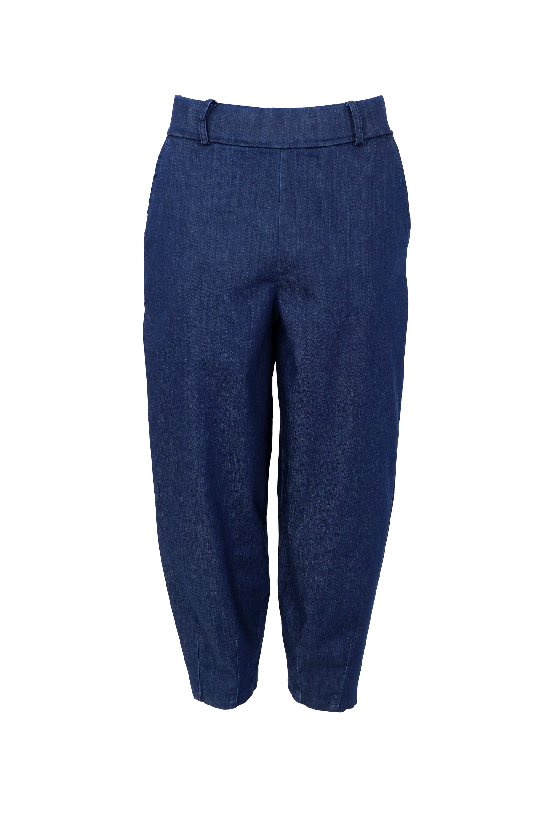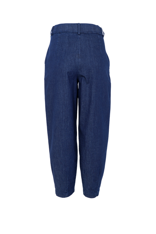 Lækre bukser fra Black Colour i mørkeblå denim og med stretch. Bukserne har en cropped benlængde og barrel pasform, som giver bukserne et moderne udtryk. De har en mellemhøj talje og bæltestropper, hvilket gør dem ideelle hvis du vælger at anvende et bælte for flere detaljer.
